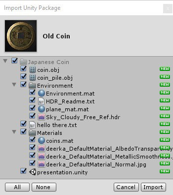 Installing large asset packages may take some time to process. Once complete, you will now see the asset package listed in it’s own ‘Japanese Coin’ folder in the Project window (bottom left as standard).