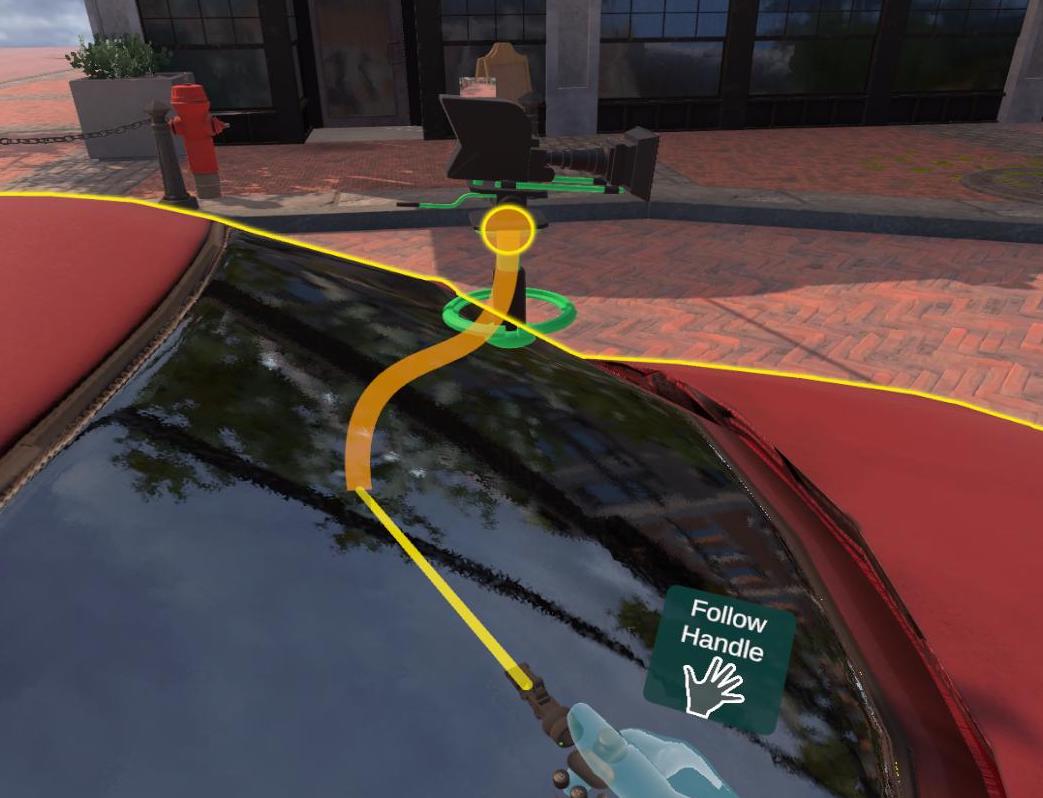You can attach a camera by using the **Attach** handle available on the [Inspect Menu](https://docs.moviestorm.co.uk/firststage/basics/working-with-things#inspect-menu). This is suitable for a security camera attached to a moving bus or if you want a shot from the POV of a moving car, etc.